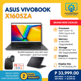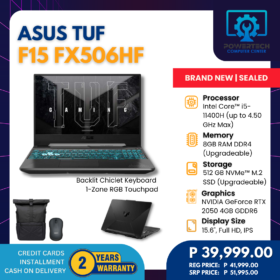 Asus | ₱39,999.00 | AMD Ryzen 5 | 8 GB DDR5 | 512 GB SSD | NVIDIA GeForce RTX 2050 Laptop GPU 4GB GDDR6 | 15.6" Full HD | ||