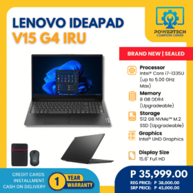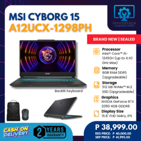 MSI | ₱38,999.00 | Intel i5 | 8 GB DDR5 | 512 GB SSD | NVIDIA GeForce RTX 2050 Laptop GPU 4GB GDDR6 | 15.6" Full HD | ||