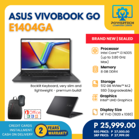 Asus | ₱23,999.00 | AMD Ryzen 3 | 8 GB DDR5 | 512 GB SSD | AMD Radeon Graphics | 15.6" Full HD | ||