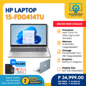 HP | ₱34,499.00 | Intel i5 | 16 GB DDR4 | 512 GB SSD | NVIDIA GeForce RTX 2050 Laptop GPU 4GB GDDR6 | 15.6" Full HD | ||