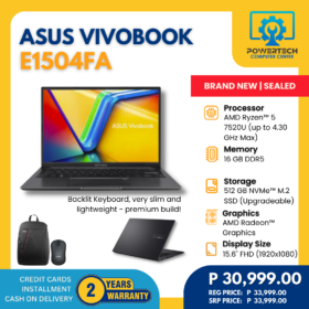 Asus | ₱30,999.00 | AMD Ryzen 5 | 16 GB DDR5 | 512 GB SSD | AMD Radeon Graphics | 15.6" Full HD | ||