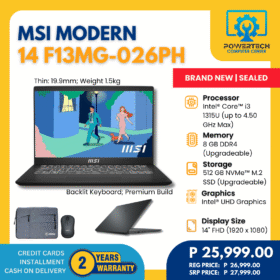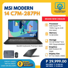 MSI | ₱29,999.00 | AMD Ryzen 5 | 16 GB DDR4 | 512 GB SSD | AMD Radeon Graphics | 14" Full HD | ||