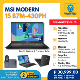MSI | ₱30,999.00 | AMD Ryzen 5 | 16 GB DDR4 | 512 GB SSD | AMD Radeon Graphics | 15.6" Full HD | ||