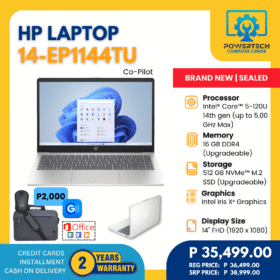 HP | ₱30,999.00 | AMD Ryzen 3 | 8 GB DDR5 | 256 GB SSD | Intel Iris Xᵉ Graphics | 15.6" Full HD | ||